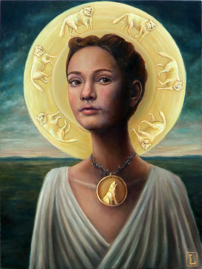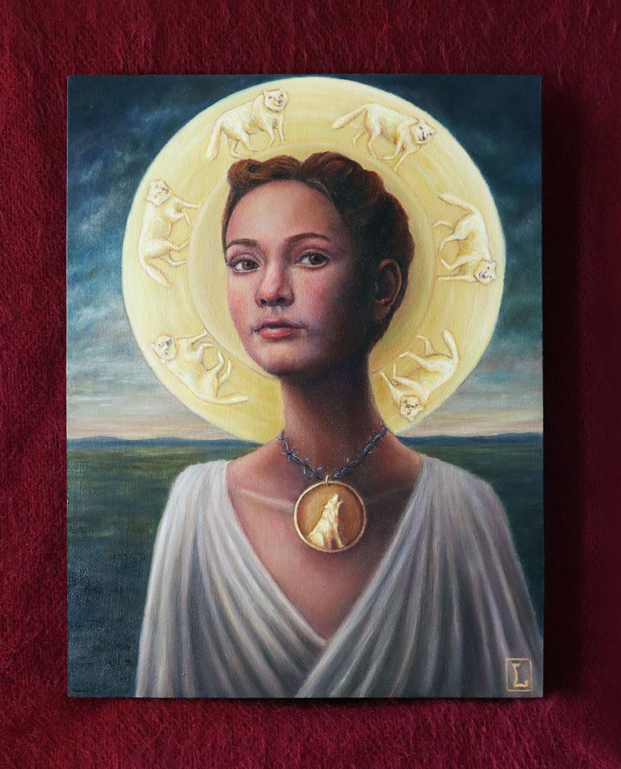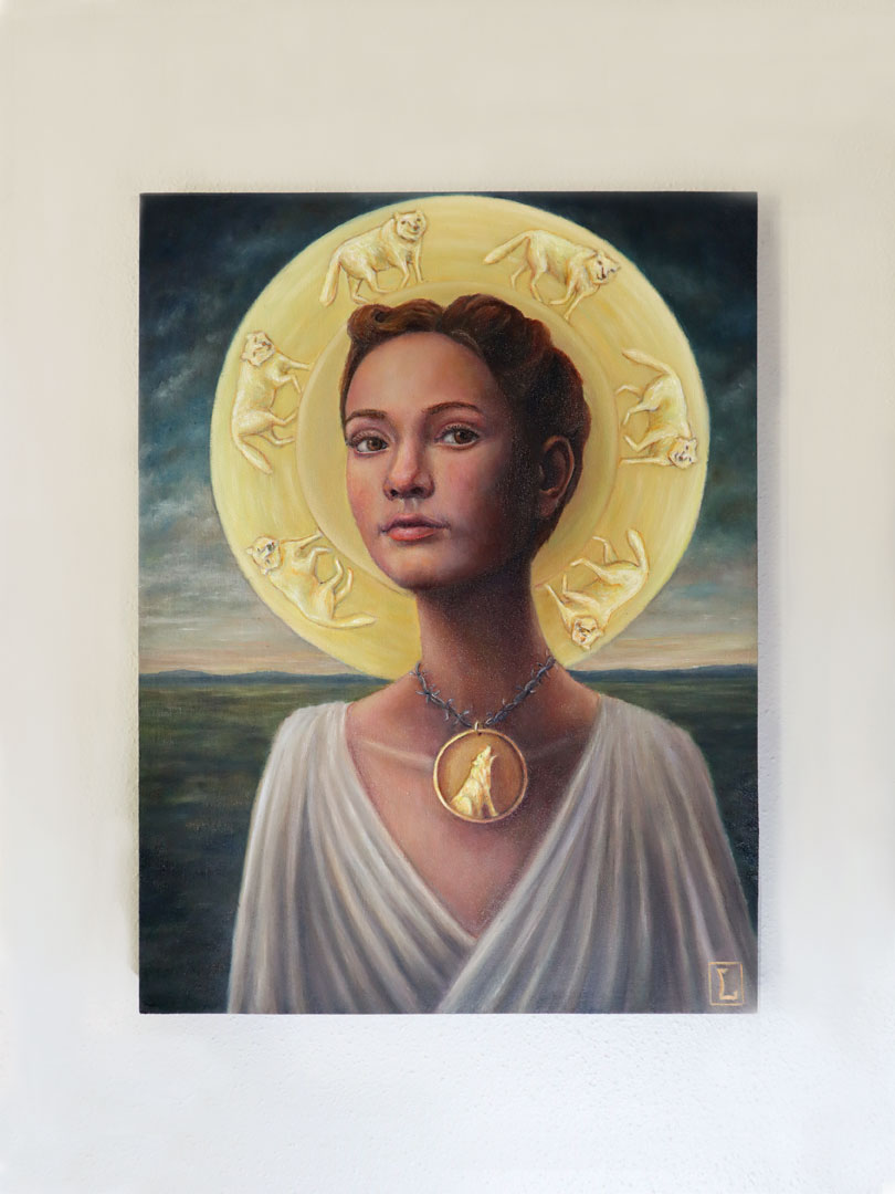 The paintings draw on christian iconography while remaining very firmly works of animism. these are not specific saints, they are representations of humans who are being forced to watch the destruction and desecration occurring around them.